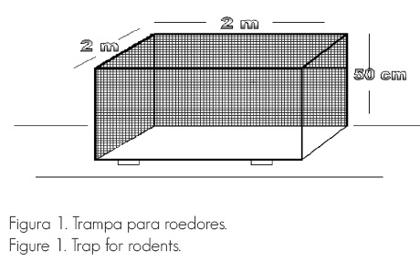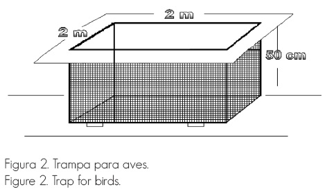 a) Roedores: consistieron en armazones de madera de 2 m de ancho por 2 m de largo por 50 cm de fondo, elaboradas con tiras de 5 x 2.5 cm. Se les cubrió por cinco lados con tela de mosquitero de aluminio de 1 m de ancho. La sexta cara quedaba al descubierto y estaba dirigida hacia el suelo. Cada trampa se colocó sobre cuatro morillos de 8 cm de altura, i.e., uno en cada esquina para permitir la entrada a los mamíferos; con este diseño se esperaría que las aves fueran excluidas (Figura 1).