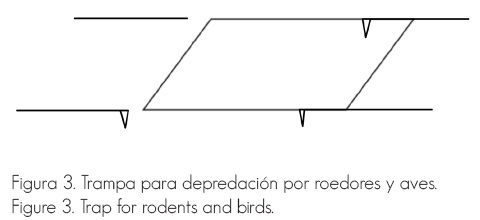 b) Aves: tenían el mismo diseño, medidas y materiales que las anteriores, pero la cara descubierta quedó hacia arriba. Se les colocó una cinta de lámina de 10 cm de ancho sobre el borde de cada uno de los lados de la cara superior, con la intención de evitar el acceso de los roedores (Figura 2).