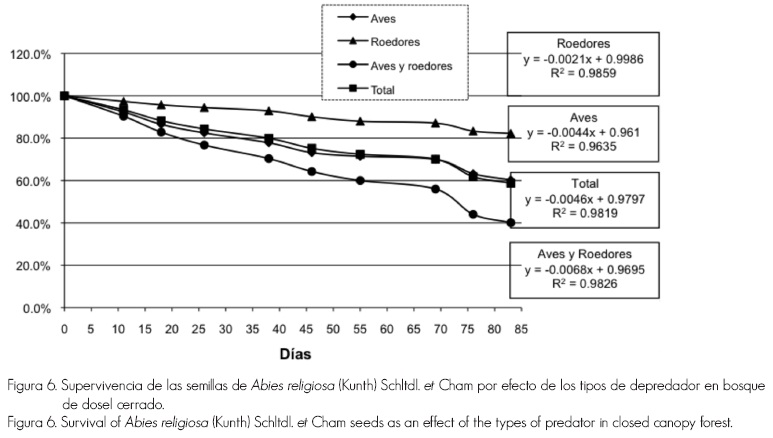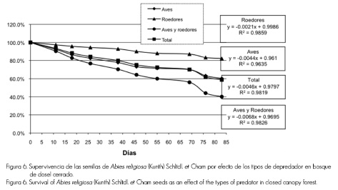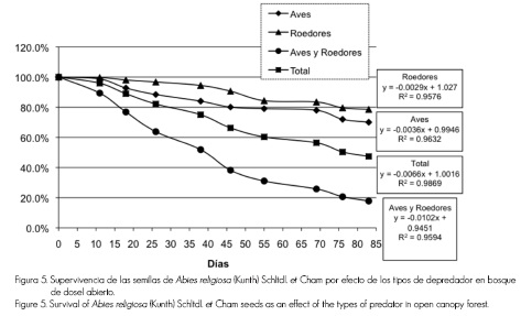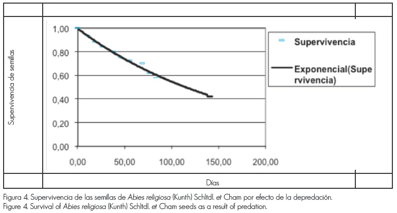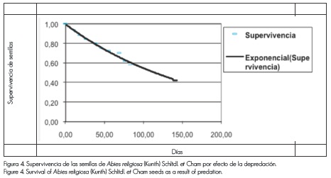 Los datos experimentales indican que la depredación de la semilla de Abies religiosa es significativamente baja, pues el porcentaje remanente en las trampas fue cercano a 100% en la mayoría de las fechas en las que se realizó el muestreo.