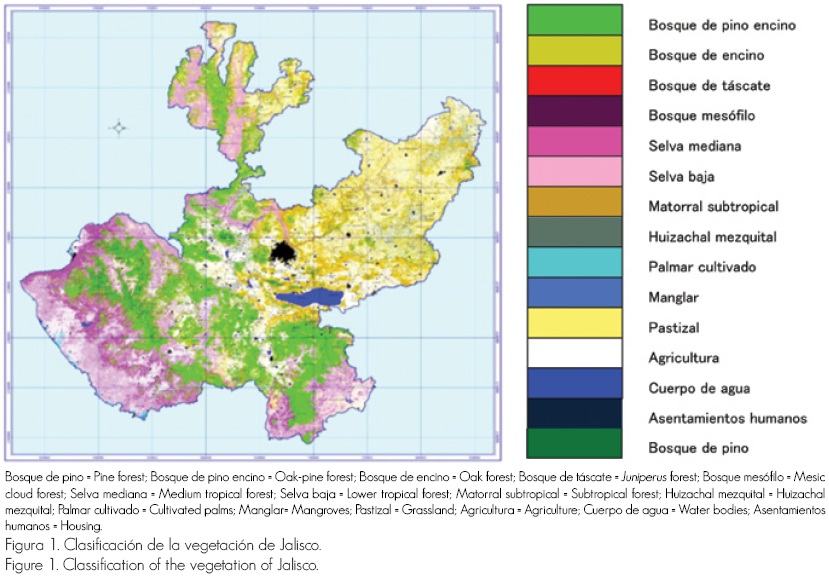 Jalisco es uno de los primeros cinco estados con mayor producción de madera, con alrededor de 9 % del total nacional. Esta entidad reúne a bosques templados, selvas y especies de climas áridos y semiáridos. Los bosques destacan por su importancia maderable, pues en ellos predominan los pinos y los encinos. Las selvas ocupan la franja costera, principalmente, y las últimas prevalecen hacia el interior (norte y noreste). En una gran proporción se desarrollan los pastizales, naturales o cultivados, además de áreas transformadas, las cuales se conforman por tierras agrícolas, zonas urbanas y poblaciones rurales. Las selvas bajas ocupan 80 % de la vegetación de la costa y se ubican en las partes bajas de la planicie costera. La selva media está en terrenos con más pendiente, con mayor humedad, a orillas de ríos y arroyos (Figura 1).