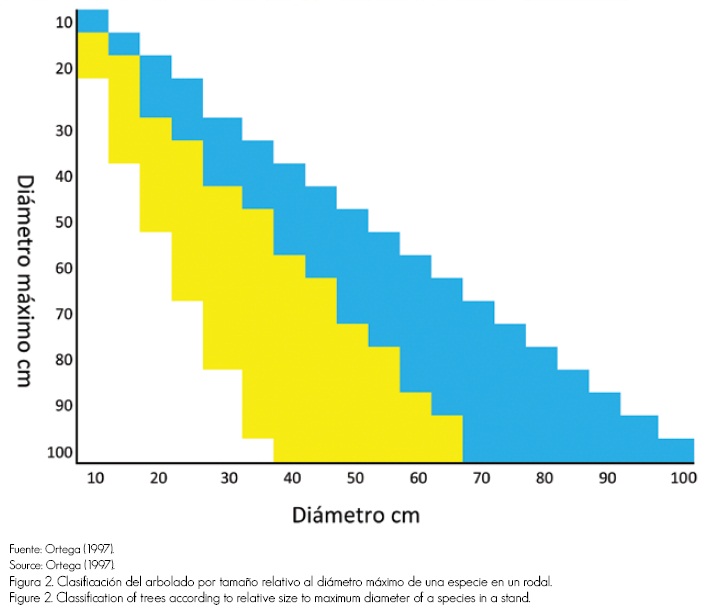 Durante los inventarios forestales en PC se utiliza el diámetro como indicador de madurez, de tal manera que para cada rodal se pueda definir el diámetro más grande por especie. Este, expresado en categorías de 5 cm, se divide en tres clases de igual amplitud: arbolado juvenil (blanco), maduro (amarillo) y viejo (azul), como se indica en la Figura 2.
