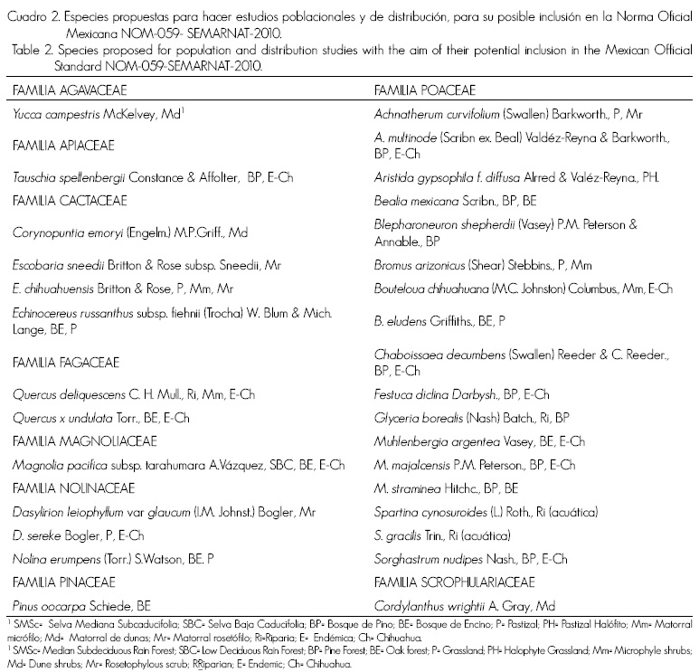 En el Cuadro 2 se consignan los 31 taxa propuestos para realizar estudios poblacionales y de distribución para su posible inclusión en la NOM-059, con base en los criterios oficiales establecidos para tal efecto (Semarnat, 2010). La revisión de la información disponible sugiere que las especies son endemismos locales, o bien registros únicos para México, o sus poblaciones están en peligro, debido a su explotación no sustentable. Las familias más abundantes fueron Poaceae, Cactaceae y Nolinaceae con 17, cuatro y tres especies, respectivamente. Con base en su distribución, los tipos de vegetación con mayor número de especies fueron el bosque de pino (10), el bosque de encino (9) y el matorral micrófilo (7).