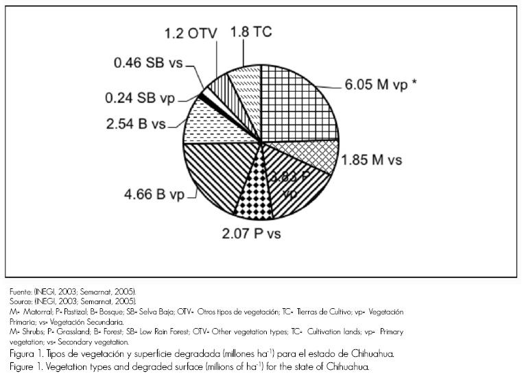 En el caso de los bosques templados, las causas de degradación son la deforestación, cambio de uso de suelo y sobrepastoreo con porcentajes de 38, 28 y 20 %, respectivamente. A nivel estatal, las tasas de deforestación anual en el período comprendido entre 1993 y 2000 fueron de -1.141, -0.427 y -0.799 ha año-1, lo que equivale a una pérdida de 473, 236, y 41 mil hectáreas en siete años, para los bosques, matorrales y selvas (Semarnat, 2005). Por otra parte, Pinedo et al. (2007) determinaron una superficie sobreestimada de 35 % para el bosque; dichos autores indican que entre 1993 y 2007 se perdieron alrededor de 630 mil hectáreas. Los pastizales no tienen un mejor estado de conservación que los bosques en el estado, ya que de 1978 a 2004, 6.4 millones de hectáreas perdieron su condición o buen estado de salud (Royo et al., 2008; Valerio et al., 2005).