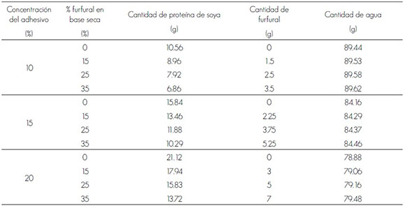 Se hicieron formulaciones adhesivas de 100 g agregando a la proteína de soya proporciones de 0, 15, 25 y 35 % de furfural, conforme a los datos que se muestran en el Cuadro 1. Para este experimento se usaron las concentraciones de adhesivo de 10, 15 y 20 %, que en un ensayo previo mostraron ser más pertinentes, por su manejo y resistencia a la tensión.
