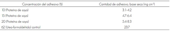 Concentraciones de sólidos superiores a 20 % en la formulación adhesiva de proteína de soya dificultan el manejo y aplicación del adhesivo en la superficie de la madera, y menores a 10 %, generan baja resistencia a la tensión.
