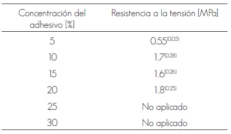 De las concentraciones estudiadas, se observó que en la de 5 %, una cantidad considerable de adhesivo escurría de la brocha, además de que las probetas mostraron una baja resistencia a la tensión (0.55 MPa) (Cuadro 3). Por otra parte, para concentraciones mayores a 25 y 30 %, la consistencia fue de una pasta viscosa muy difícil de aplicar a la superficie de las chapas de madera. Las concentraciones más pertinentes para su aplicación fueron de 10, 15 y 20 %, mismas que generaron los mejores valores de resistencia a la tensión de 1.7, 1.6 y 1.8 MPa, respectivamente.
