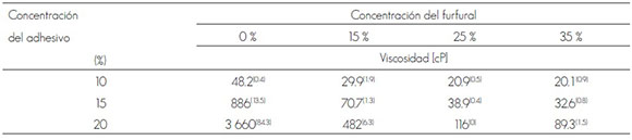 La viscosidad de los adhesivos sin furfural registró los valores mayores; para 10 % de sólidos fue de 48.2 cP y para 20 % aumentó hasta 3 660 cP. La adición de furfural produjo una importante disminución de la viscosidad, lo que pudiera atribuirse a que una cantidad de soya es sustituida por dicho producto; conforme fue mayor su proporción, se redujo la viscosidad.