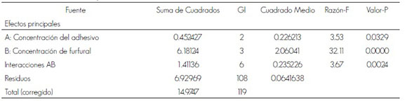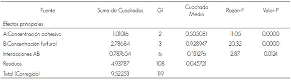Se realizó un análisis de varianza multifactorial, mediante el programa Statgraphics Centurion XV, para determinar el efecto de la concentración del adhesivo y la de furfural sobre la resistencia a la tensión, a partir de los niveles de variables indicados en el Cuadro 1. Se hicieron 10 réplicas para cada combinación de factores. También se utilizó un análisis de varianza unifactorial para detectar diferencias estadísticas de la resistencia a la tensión.