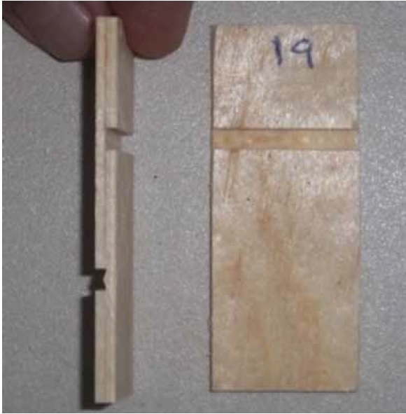 Se realizaron pruebas exploratorias para determinar las mejores concentraciones de proteína de soya, para ello se prepararon mezclas adhesivas con la dispersión de proteína de soya en agua destilada a contenidos de sólidos de 5, 10, 15, 20 y 25 %, sin la adición de furfural. A cada formulación se le evaluó su capacidad adhesiva, mediante ensayo de tensión en probetas de chapas de pino (Figura 1) de acuerdo a la norma ASTM D-2339-98 (ASTM, 1998), para seleccionar las concentraciones apropiadas para la preparación de adhesivos de proteína de soya con furfural.