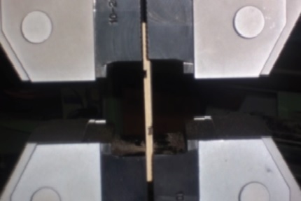 Las probetas de chapa de pino encoladas con los adhesivos base proteína de soya fueron acondicionadas a una humedad relativa del aire de 50 ± 2 % y una temperatura de 23 ± 1 °C, hasta lograr su peso constante. Enseguida se les determinó la resistencia a la tensión, conforme a las indicaciones de la norma ASTM D-2339-98 (ASTM, 1998), por medio de una máquina universal de ensayos físico-mecánicos Karl Frank modelo 81105 de una capacidad de carga máxima de 50 kN.