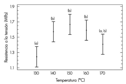 La Figura 4 muestra la influencia de la temperatura de curado sobre la resistencia a la tensión. Es notoria una tendencia a incrementarse la resistencia de los 130 a lo 150 °C, en la que se observa un claro descenso a las temperaturas de 160 y 170 °C. El análisis de varianza corroboró la diferencia estadística significativa (P = 0.0178) de la resistencia a 130 °C, con respecto las obtenidas a 140, 150 y 160 °C, para un 95 % de confiabilidad. Las de 140 a 170 °C no incidieron significativamente en la resistencia a la tensión, por lo que para la selección de la temperatura de curado del adhesivo proteína de soya-furfural, se optó por la de 150 °C, ya que favorece el mayor valor promedio de la resistencia a la tensión.