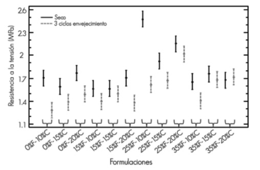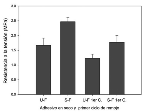 La adición de 25 % de furfural y concentraciones de 10, 15 y 20 % del adhesivo generaron las mejores resistencias a la tensión en seco con respecto al resto de formulaciones; entre ellas la formulación de 25 % furfural y 10 % de concentración fue sobresaliente al alcanzar un promedio de 2.5 MPa, y en comparación con la formulación sin furfural, registró un incremento de resistencia de 45 % (Figura 5).