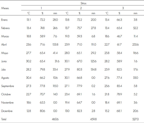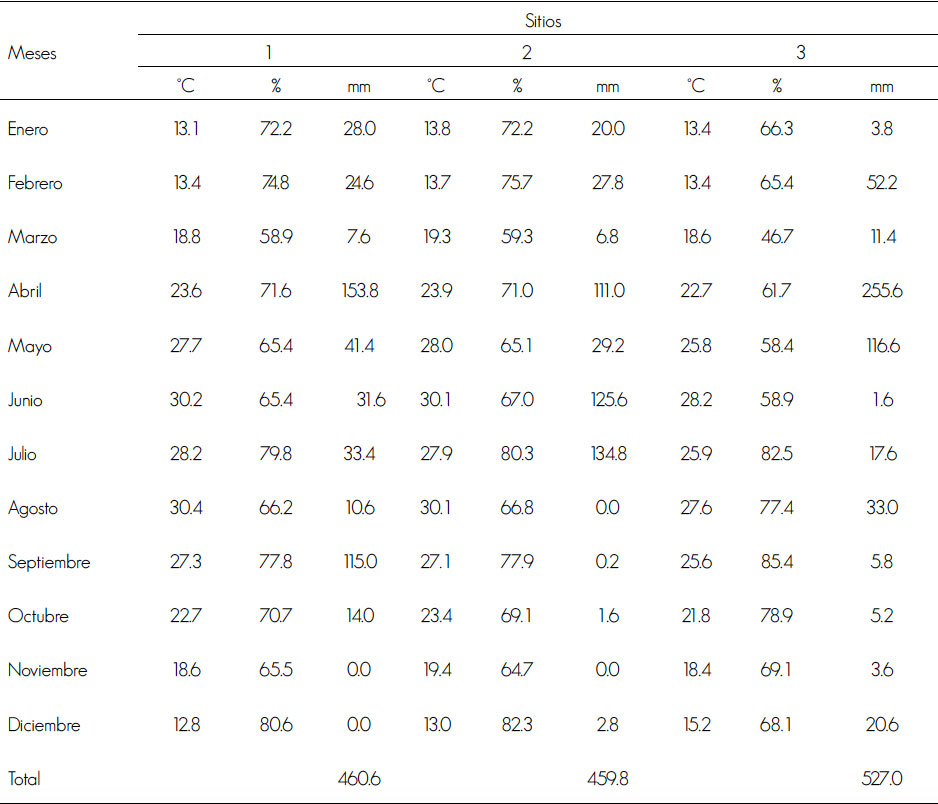 En los sitio de muestreo se obtuvieron mediciones horarias de la temperatura ambiente (°C) y humedad relativa (%) mediante sensores automatizados tipo HOBO (Familia H8). Se registró la precipitación pluvial diaria (mm) durante el periodo experimental en un pluviómetro automatizado marca HOBO (Cuadro 1).