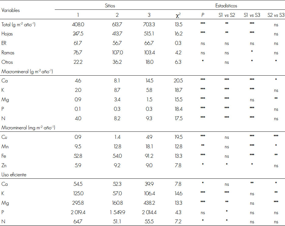 * = P< 0.05; ** = P< 0.01; *** = P < 0.001; ns = No significativo. ER = Estructuras reproductivas; Otros = Material no identificado, cuerpos de insectos y heces de insectos; Uso eficiente de nutrientes = [hojas (g m-2 año-1) / mineral en hojas (g m-2 año-1)] (Vitousek, 1982). La significancia de la prueba de Kruskal-Wallis y de la prueba Mann-Whitney U para la comparación de medias entre los sitios se muestra en la columna derecha.