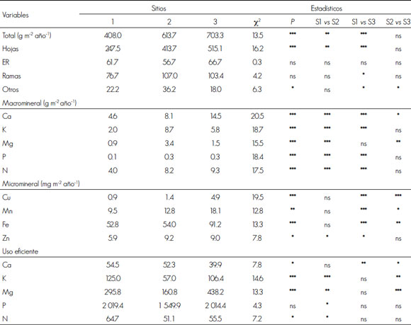 El uso eficiente de los macrominerales [hojas (g m-2 año-1x)/ mineral en hojas (g m-2 año-1)] provenientes de las hojas está relacionado con su aprovechamiento para producir nueva biomasa. En este estudio, tal concepto para Ca, K, Mg y N fue significativamente mayor en el sitio 1 que en los sitios 2 y 3, mientras que el del P no fue diferente entre ellos (Cuadro 2). Aun cuando el depósito de P en general fue bajo, su uso eficiente fue mayor que el del Ca, K, N o Mg. Resultados similares se han sido confirmado en diferentes ecosistemas forestales (Del Valle, 2003; Swamy et al., 2004; Safou et al., 2005).