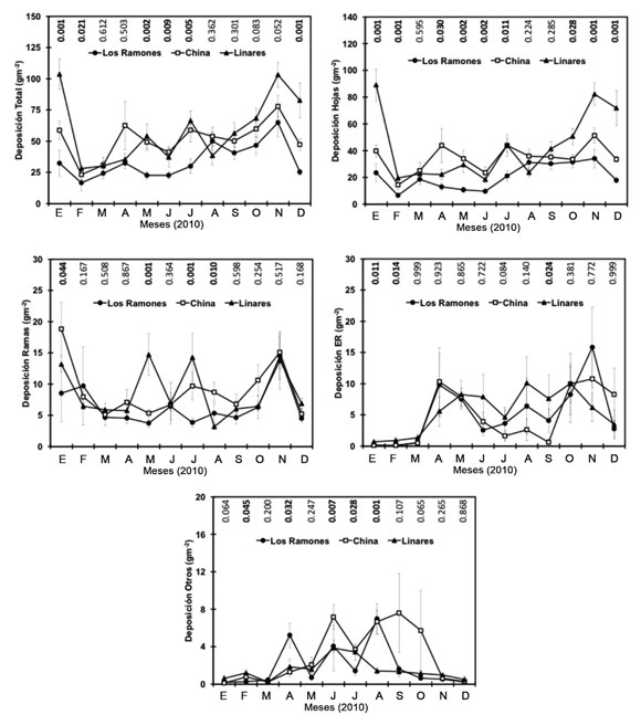 Las producciones mensuales totales de dichos materiales mostraron variaciones significativas entre sitios, aunque no hubo significancia en algunos meses (Figura 1). La producción total de hojarasca más alta se presentó en el sitio 3 (de 28 a 123 g m-2), mientras que en el sitio 1 fue la más baja (16 a 64 g m-2). En los tres sitios, las menores producciones se verificaron en febrero y las mayores en noviembre. La producción de hojas también fue superior en el sitio 3 con un intervalo de 18.4 (junio) a 89.0 g m-2 (enero) y las mínimas se registraron en sitio 1 con producciones de 6.5 (febrero) a 34.0 (noviembre). El acopio de estructuras reproductivas fue más reducido en enero (0.09) y mucho más cuantioso (10.8 g m-2) en el sitio 2, en noviembre. La máxima producción de ramas fue en enero (18.8) en el sitio 2, y la mínima en agosto (3.1 g m-2) en el sitio 3. Para el componente "otros", la producción mínima (0.11) se obtuvo en enero y la máxima (7.6 g m-2) en septiembre en el sitio 2.