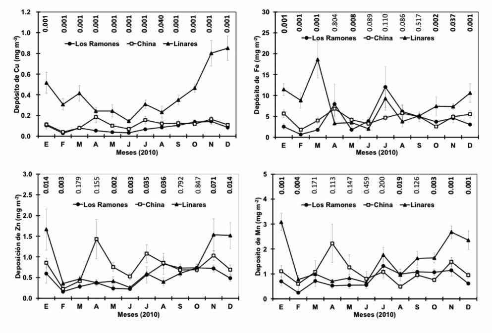 El aporte potencial (mg m-2 año-1) de Cu fue 1.0, 1.4 y 4.9 para los sitios 1, 2 y 3, respectivamente; de Mn de 9.5, 12.8 y 18.1; de Fe de 52.8, 54.05 y 91.25 y de Zn de 5.9, 9.2 y 9.0. Sin importar el sitio, el depósito potencial anual de micronutrientes se distribuyó en el siguiente orden: Fe>Mn>Zn>Cu (Cuadro 2). El depósito total anual (Cu+Mn+Fe+Zn) fue 69.2, 77.5 y 123.1 mg m-2 año-1 en el sitio 1, en el 2 y en el 3, respectivamente. En los tres, el hierro alcanzó niveles muy elevados en relación a los otros elementos analizados, el sitio 3 fue donde se determinó la más alta producción.