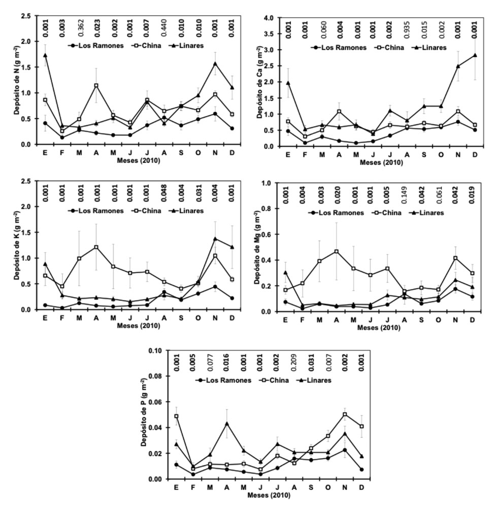 La eficiencia del uso de nutrientes [hojas (g m-2 año-1)/mineral en hojas (g m-2 año-1)] de macrominerales en forma individual no mostró una tendencia clara entre los sitios (Cuadro 2). Para N, P y K el patrón fue el siguiente: Los Ramones > Linares > China; para Mg fue: Linares > Los Ramones > China, y para Ca fue: Los Ramones > China > Linares.