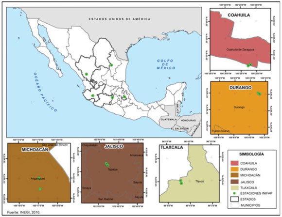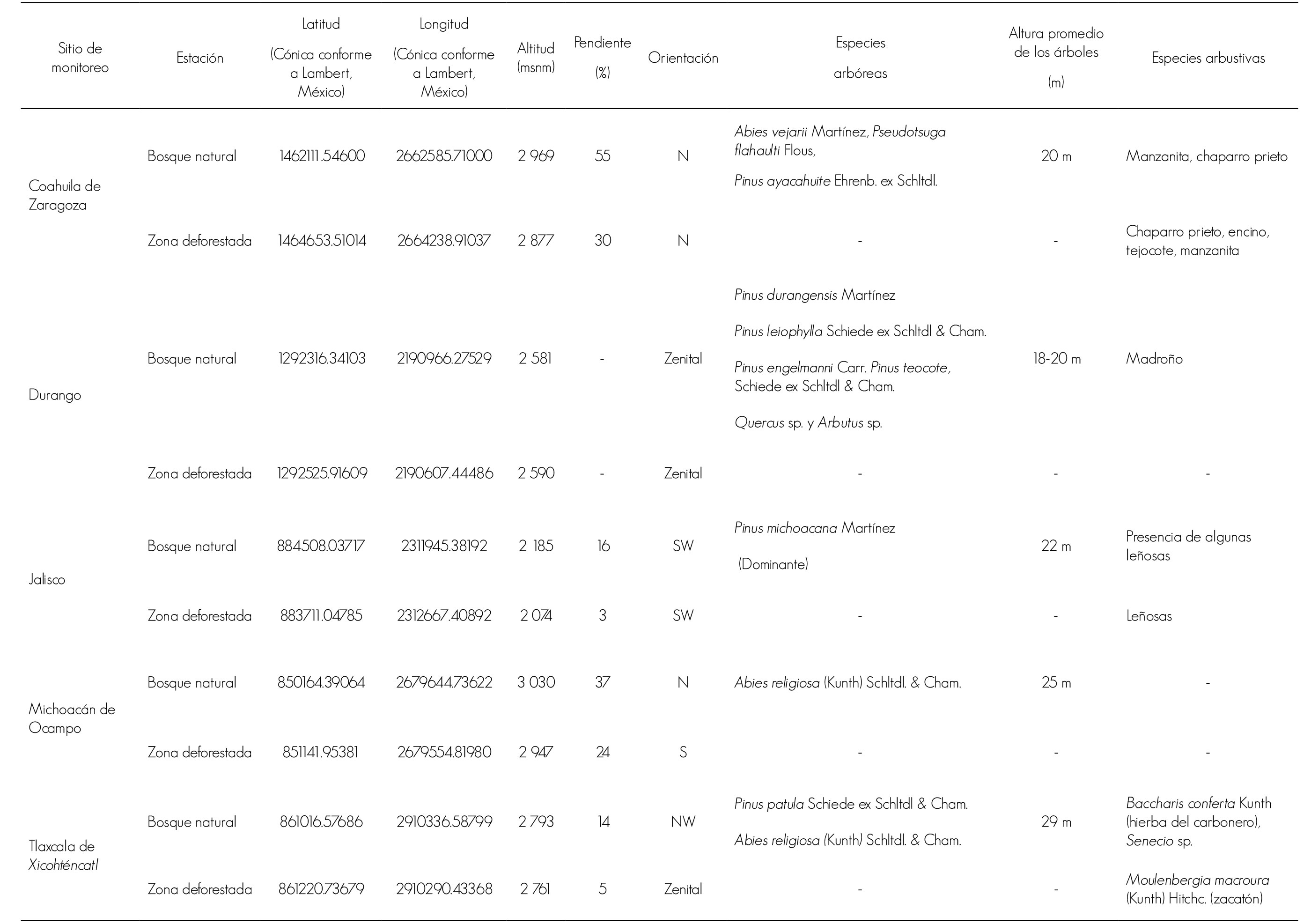 En cada sitio se colocó una estación climatológica automatizada, Davis Institute Corporation Modelo Vantage Prod. 2, dentro del bosque de coníferas (Abies o Pinus) con una cobertura mínima de 60 % y una altura promedio de los árboles de 25 m, seleccionados bajo el criterio de que no tuvieran evidencia de disturbio reciente, plagas o enfermedades. También se puso otra estación climatológica en un área cercana deforestada con una separación mínima del bosque de 200 m, en los estados de Michoacán, Tlaxcala, Jalisco, Durango y Coahuila (Figura 1). Las estaciones fueron dispuestas en la superficie y los sensores de temperatura a 1.5 m de altura del suelo. La variable medida fue la temperatura (máxima, mínima y media) de mayo de 2012 a junio 2013 y se registró cada 30 minutos, en bosque y área deforestada, por especie y superficie deforestada; además de la temperatura diurna y nocturna en cada opción. Las características de los sitios se describen en el Cuadro 1.