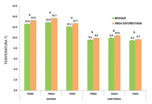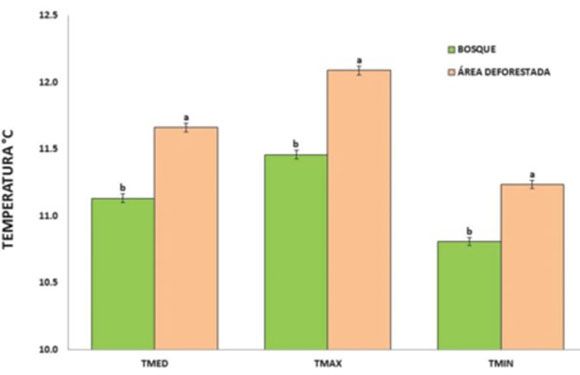 Las temperaturas máxima, mínima y media fueron mayores en el área deforestada en comparación con la forestada en un intervalo de 0.43 °C a 0.63 °C.