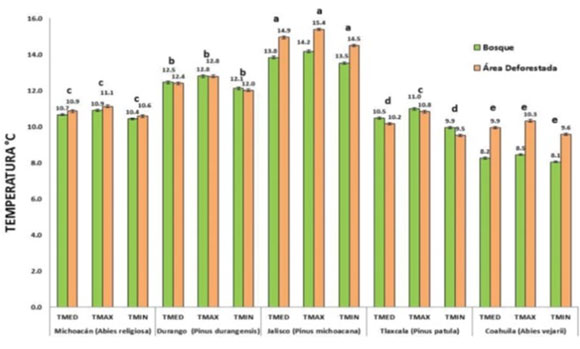 En la Figura 3 se observan las diferencias promedio de temperaturas media, máxima y mínima, en la que se muestra que son distintas entre todos los tipos de bosque. Solo el oyametal (Abies religiosa) y el de Pinus patula no presentan diferencias significativas en la media de temperatura máxima registrada, en ambos sitios. El bosque de Pinus michoacana registra las cifras más elevadas con respecto a los demás tipos con valores desde los 13.5 °C mínima en el bosque a 15.4 °C máxima en el área deforestada. El caso contrario corresponde a Abies vejarii cuyas temperaturas varían de 8.1 °C a 10.3 °C.
