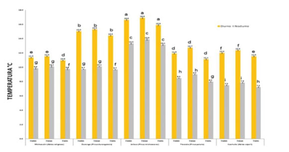Palabras clave: Abies spp., Pinus spp., temperatura diurna, temperatura máxima, temperatura mínima, temperatura nocturna.