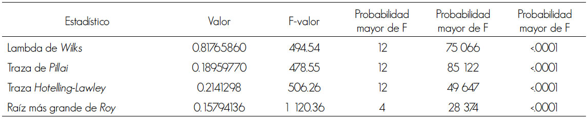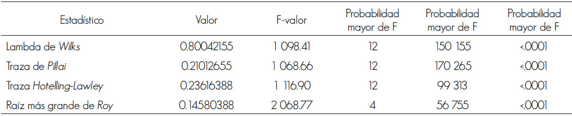 Los resultados de la prueba estadística de MANOVA para probar si existen diferencias significativas entre los sitios seleccionados con y sin arbolado, se presentan en el Cuadro 3; se advierte que los cuatro criterios resultaron estadísticamente significativos para la prueba F. Se rechaza, entonces, la hipótesis planteada (Ho), lo que sugiere que al menos un vector de efectos de los promedios de los sitios produce diferencias significativas en las temperaturas por tipo de bosque. Este resultado confirma las diferencias significativas obtenidas en los análisis de variancia individuales de cada variable e indica la existencia de diferencias reales, que no se deben al azar.