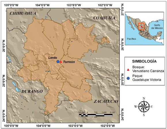 Figure 2. Geographical location of the sampling sites at Guadalupe Victoria Park in Lerdo, Durango, and the Venustiano Carranza Forest in Torreón, Coahuila.