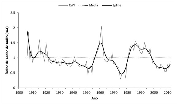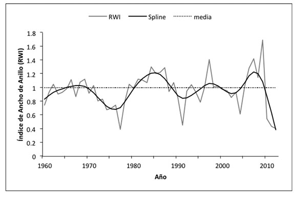 Los índices estandarizados se calculan al dividir el valor de ancho de anillo entre el valor obtenido de la curva. Los valores de las series estandarizadas se promediaron y se obtuvo una cronología promedio normalizada (sin tendencias) del sitio. A la serie dendrocronológica generada, se le fijó una curva flexible a nivel década para resaltar períodos de baja frecuencia; es decir, períodos de bajo y alto crecimiento como función del clima (Cook y Peters, 1981).