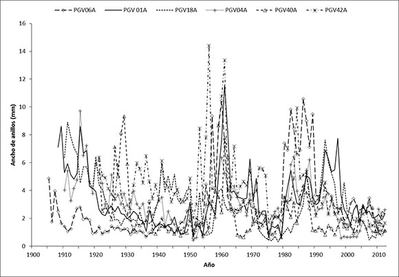 La cronología generada para el PGV se extiende para el período 1905-2012 (108 años) (Figura 3). La serie de tiempo evidencia períodos muy prolongados de crecimiento inferior a la media (1.0), solo al inicio de su establecimiento (1900-1910), década de 1960; y en el período 1980-2000, superó el promedio. Posterior al año 2000, el crecimiento ha decaído marcadamente y esta tendencia de reducción se ha mantenido hasta la actualidad.