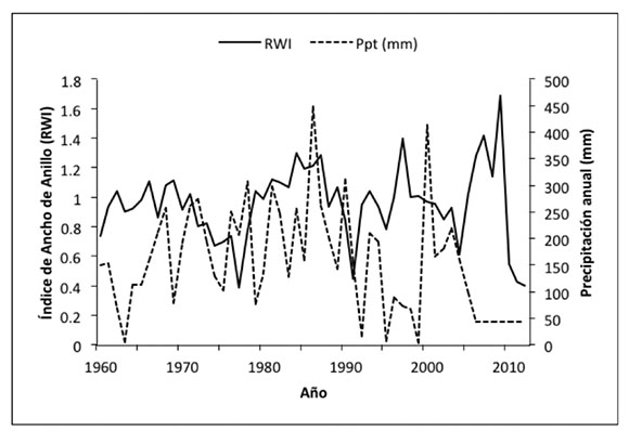 La relación entre el índice de ancho de anillo y la precipitación anual no fue significativa (r= 0.019, p>0.05); aunque, algunos años fueron anormalmente secos (1963, 1969, 1979, 1990, 1997, 1999 y 2009), se observó un buen crecimiento de la especie, lo cual sugiere que, a través del riego, se les proporcionó agua adicional para subsanar el déficit hídrico.
