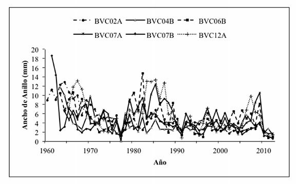 Las series de medición de crecimiento anual (ancho de anillos en mm) se integraron en un gráfico tipo "espagueti" para determinar períodos de liberación y compresión; así como su relación con factores bióticos y abióticos, particularmente períodos donde la falta de riego afectó el crecimiento durante uno o varios años consecutivos; además aquellos episodios cuando la disponibilidad de agua fue la adecuada para el crecimiento del arbolado.