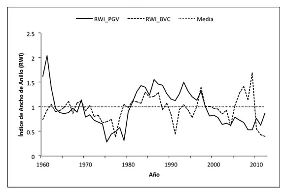 En esta ocasión, se generaron dos cronologías de anillo total de fresno, las cuales se fundamentaron en un tamaño de muestra considerable, que soporta estadísticamente y con confiabilidad los parámetros dendrocronológicos derivados de los programas de control de calidad COFECHA (Holmes, 1976) y de estandarización, ARSTAN (Cook, 1987). La intercorrelación entre series para las muestras de los dos sitios de colecta estuvo en el orden de 0.44 para el PGV y de 0.49 para BVC; la sensibilidad media con valores de 0.359 y 0.245, también se ubica en el intervalo normal (Constante et al., 2010, NOAA, 2014). Dichos valores son similares o superiores al que se logra con otro taxón de hábitos ribereños, como el ahuehuete (Taxodium mucronatum Ten.),con el cual ocasionalmente se asocia y que se distribuye en bosques de galería del norte y centro de México (Stahle et al., 2011; Correa et al., 2014; Villanueva et al., 2014). Los parámetros dendrocronológicos cobran especial relevancia al considerar que la especie en ambos sitios es cultivada y sus incrementos radiales anuales tienen gran influencia de las labores culturales de las que han sido objeto