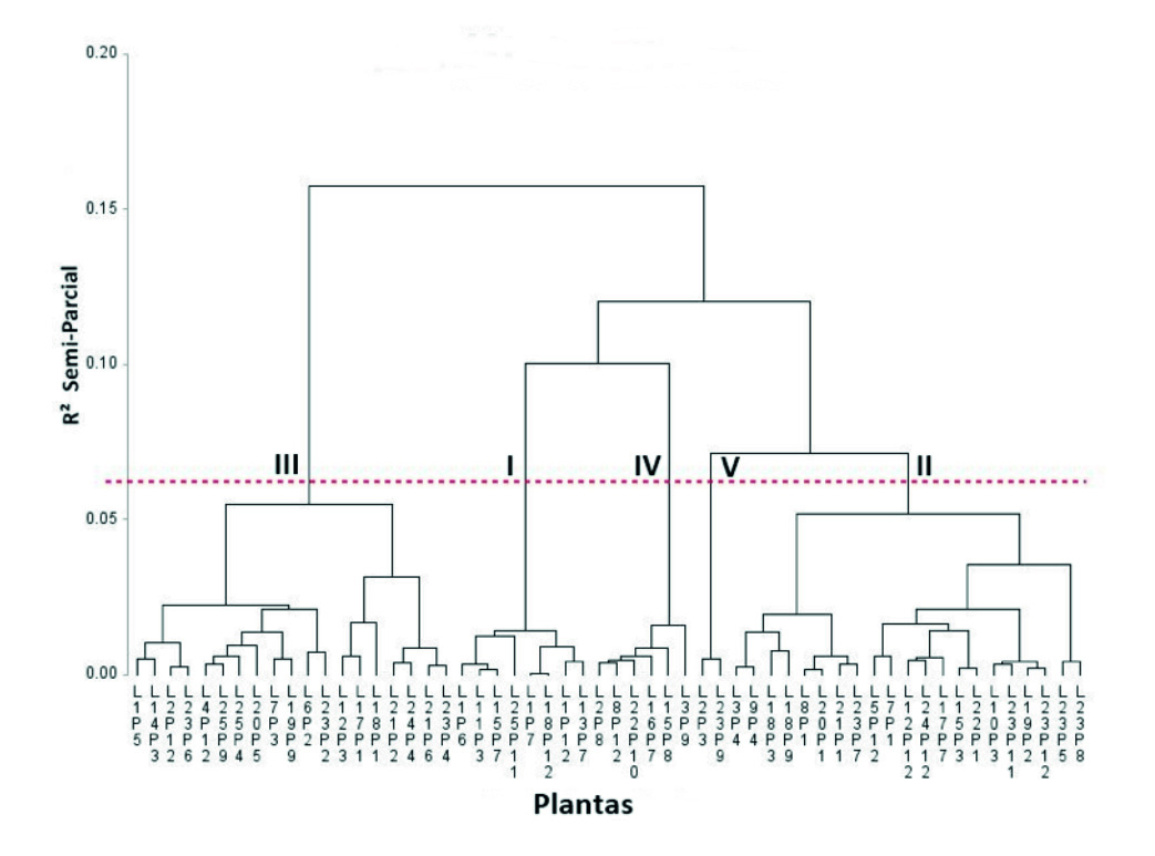 Por lo tanto, las 56 plantas de jojoba conformaron cinco grupos, que varían de sólo dos individuos en el grupo V a 21 plantas en el grupo II. Además, la prueba de la distancia de Mahalanobis (Cuadro 2) corroboró que todos los grupos de plantas son diferentes (P < 0.0001).