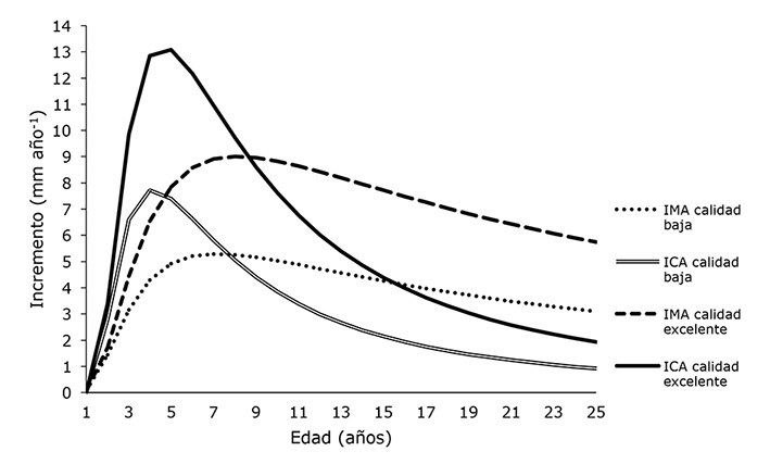 La intersección entre el ICA e IMA muestra el momento preciso en el que los incrementos son los óptimos; es decir, cuando el árbol alcanza los mejores rendimientos maderables (Martínez et al., 2014). Los sitios que difieren en calidades de estación presentan incrementos óptimos casi al mismo tiempo (calidad baja a los 8 años y calidad excelente a los 9 años), lo que implica que tienen un comportamiento similar. Sin embargo, los incrementos de madera temprana en sitios con calidad excelente fueron de 9 mm, a diferencia de los sitios con calidad baja que alcanzaron 5 mm (Figura 4). Sobre el particular, Pompa-García y Domínguez-Calleros (2015) indican que las buenas capacidades ecológicas del sitio impactan positivamente en el crecimiento de los árboles.