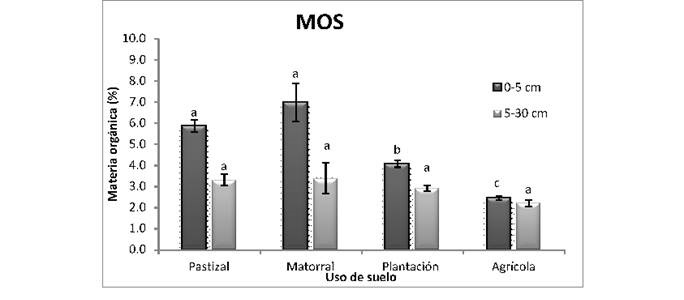 La MOS y COS no registran diferencias en la profundidad 5-30 cm en los distintos usos del suelo. El contenido de MOS y Nt para los diferentes usos del suelo en ambas profundidades tiene el siguiente orden: Matorral > Pastizal > Plantación > Agrícola.