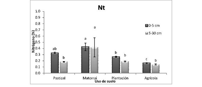 Los resultados de la comparación de medias para Nt mostraron diferencias para los usos del suelo en las dos profundidades bajo estudio. Para la de 0-5 cm, el matorral y el pastizal presentaron los valores más altos de 0.43 y 0.33 %, respectivamente; mientras que el sistema agrícola tuvo el más bajo contenido (0.14 %).
