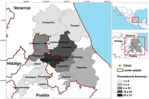 El ITSVC tiene una concurrencia de 477 personas en promedio, entre estudiantes de las carreras de ingeniería (Forestal, Geociencias, Industrias Alimentarias, Sistemas Computacionales y Gestión Empresarial), personal docente y administrativo. Existe una alta diversidad en aspectos culturales, religiosos y económicos acentuada principalmente por la procedencia del alumnado, de municipios de dos entidades federativas, Puebla: Venustiano Carranza, Pantepec, Jalpan, Xicotepec, Zihuateutla, Jopala y Huauchinango; y Veracruz: Tihuatlán, Francisco Z. Mena, Coatzintla, Poza Rica, Espinal, Papantla, Tuxpan, Temapache y Castillo de Teayo (Figura 2).