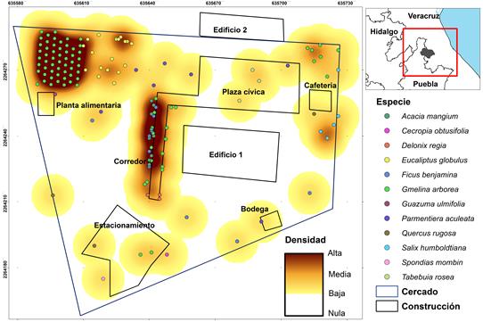 La caracterización del arbolado urbano se basó en el método propuesto por Benavides et al. (2012); para ello, en octubre del 2016 se hizo un inventario en el que se registraron datos de especie, diámetro normal (D), altura total (H) y la ubicación geográfica del árbol muestreado. A cada individuo se le asignó un número consecutivo, para mantener un orden de registro, los cuales se digitalizaron en el programa QGIS 2.18.11 (QGISDT, 2017). Con la herramienta heatmap (mapa de calor), se generó un mapa cartográfico sobre la densidad del arbolado, que permitió definir los niveles de densidad (alta, media, baja y nula). Se utilizó el método propuesto por Otaya et al. (2006) y Escobedo et al. (2011) para clasificar el nivel de riesgo y adoptar medidas óptimas de prevención o corrección.