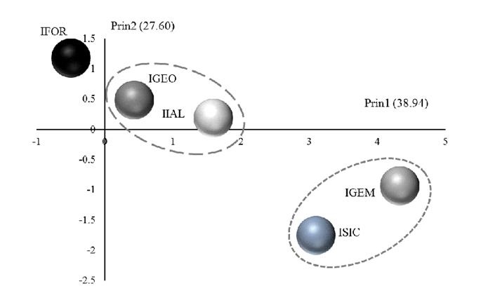 Del Análisis de Componentes Principales (ACP) resultó que la primera componente (Prin1) agrupa variables sobre el miedo a la caída de ramas o individuos completos que pueda ocasionar daños a las instalaciones o transeúntes; explicó 38.94 % de la varianza total en los datos. La segunda componente (Prin2) contempla variables sobre las consecuencias económicas (afectaciones a inmuebles y propiedades que generen gastos de reparación) y sociales (afectaciones a personas), que producen los desastres naturales y aporta 27.60 % de la covarianza total; entre ambas explican 66.54 % de la varianza total de los datos (Figura 4). Estos datos concuerdan con lo que establecen Slovic et al. (1982) y Beck (2006) en el entendido de que a medida que se tiene más información sobre las consecuencias de los desastres naturales, la percepción del riesgo es menor; lo anterior puede ser la razón de por qué en el ITSVC, la población de las ingenierías de perfil industrial como en Gestión Empresarial (IGEM) y en Sistemas Computacionales (ISIC) registraron los mayores niveles de percepción de riesgo. Por el contrario, las disciplinas cuya vocación es ambiental, como la Forestal (IFOR) y en Geociencias (IGEO), tienen mayor aversión al riesgo.