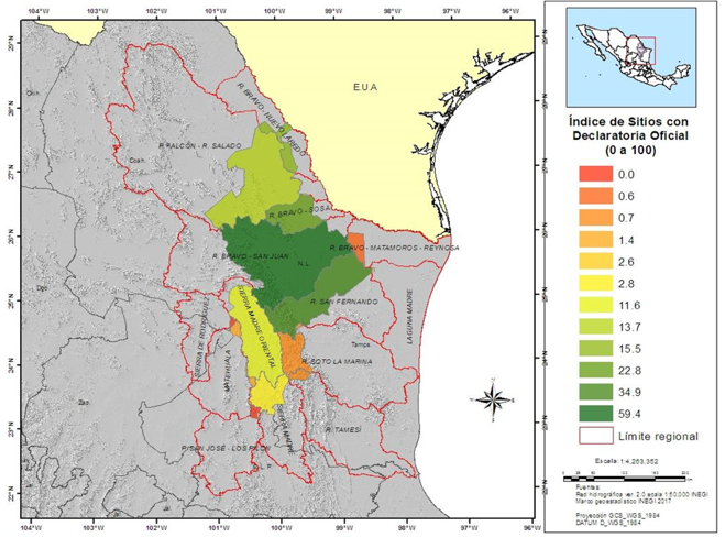 El Índice del Grado de Conservación correspondiente a las cuencas Río Bravo-San Juan y San Fernando, evidencia los altos impactos ambientales que registran, a pesar de contar con el mayor número de instrumentos legales para la conservación, como lo denotan sus altos valores para el índice de Sitios con Declaratoria Oficial.