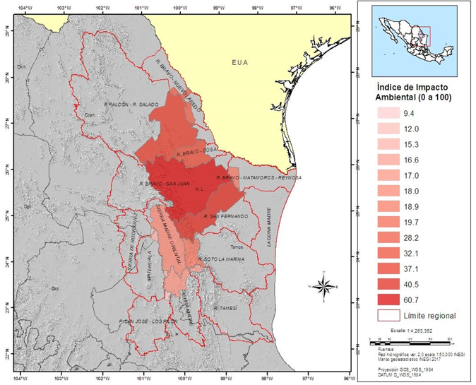 Las dos cuencas que registraron los valores más altos de impacto ambiental fueron Río Bravo - San Juan y Río San Fernando, con 60.7 y 40.5 puntos, respectivamente (Cuadro 5; Figura 4). Es importante señalar que las cuencas: Presa Falcón - Río Salado y Sierra Madre Oriental, que representan 34 % de la extensión territorial de Nuevo León, tuvieron valores de impacto ambiental, relativamente, bajos con 37.1 y 18 puntos, respectivamente; por lo que deben ser consideradas por los tomadores de decisiones como prioritarias para fines de intensificar su aprovechamiento como fuente de agua, a partir de la premisa de su conservación (Figura 4; Cuadro 4).