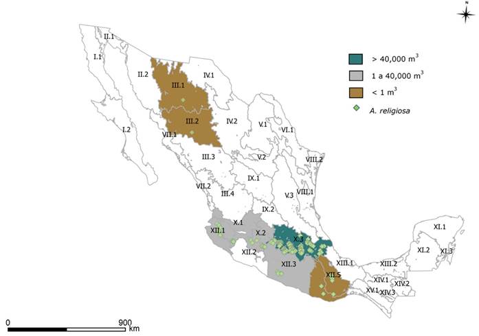 Con respecto a la producción de madera, el análisis determinó que la ZMG X.3 presentó la mayor cantidad, con 67.94 %; mientras que X.1, X.2, XII.1 y XII.3 contribuyeron con 32.06 % (Cuadro 2, Figura 1); las zonas III.1, III.2, XII.4 y XII.5 no aportaron a la producción maderable (0.00 %), lo cual está relacionado con la baja densidad de individuos de A. religiosa (5 a 91 individuos del INFyS en las zonas) en los bosques naturales (Ruelas y Dávalos, 1999). Los resultados denotan que el mayor volumen se obtiene de los bosques localizados en la parte central del país: zona X.3 (Hidalgo, Michoacán, Morelos, Puebla, Tlaxcala, Veracruz), por lo que es necesario mantener e incrementar las actividades de manejo sostenible en ella, para perpetuar la especie en cuestión y aprovecharla con otros fines; por ejemplo, servicios ecosistémicos (Cepeda et al., 2016).