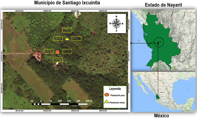 Las plantaciones evaluadas (PP y PM) se geoposicionan a 21°43'35.7" N; 105°06'47.1" O y 21°43'38.3" N; 105°06'46.4" O, dentro del municipio Santiago Ixcuintla, en el estado de Nayarit (Figura 1). Su establecimiento data de junio de 2001 y pertenecen a la empresa Agroforestales Nayarita. El área se caracteriza por presentar un clima cálido subhúmedo, con lluvias en verano, de humedad media [Aw1 (w)], según la clasificación de Köppen modificada por García (1987); la temperatura media anual es de 24.4 °C, la máxima ocurre entre los meses de abril y julio (Inegi, 2017); con una precipitación total anual de 1 529 mm con variaciones entre el periodo más seco y el más lluvioso de 1 085 a 2 367 mm (Inegi, 2017). Altitudinalmente, se ubica entre 0 - 800 msnm.