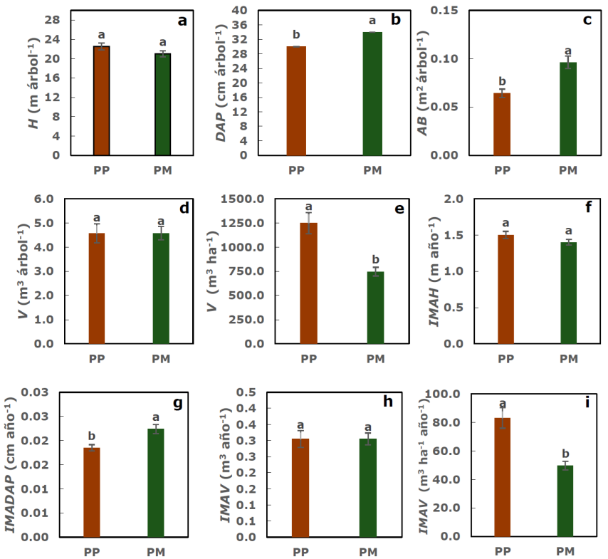 Medias con distintas letras en cada barra (error estándar) son estadísticamente diferentes (Tukey, p ≤ 0.05). a) Altura total (H); b) diámetro a la altura del pecho (DAP); c) Área basal (AB); d) Volumen (V); e) Volumen por superficies (V); f) Incremento medio anual en altura total (IMAH); g) Incremento medio anual en diámetro (IMADAP); h) Incremento medio anual en volumen (IMAV); i) Incremento medio anual en volumen por superficie (IMAV ha-1año-1).