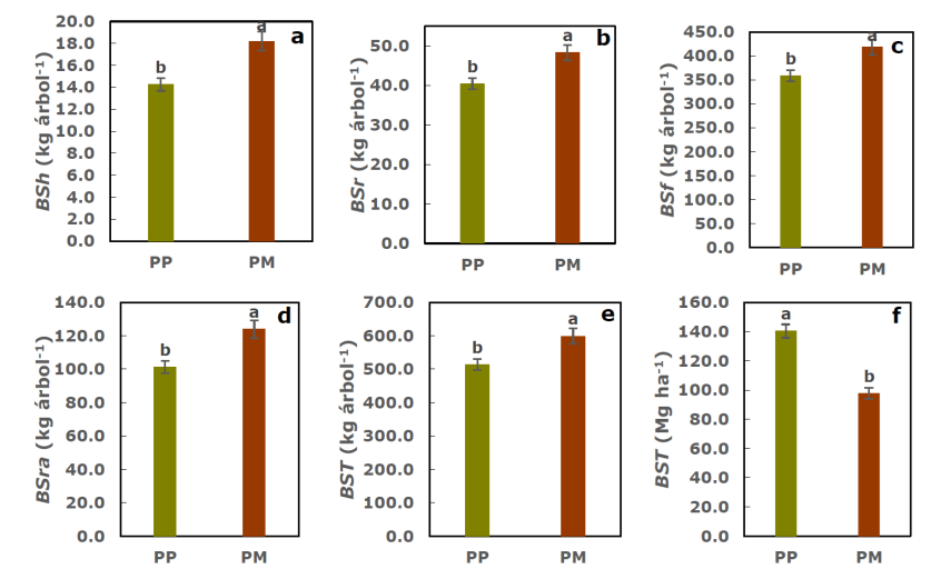 *Medias con distintas letras en cada barra (error estándar) son estadísticamente diferentes (Tukey, p ≤ 0.05). a) Biomasa seca de hojas (BSh); b) Biomasa seca de ramas (BSr); c) Biomasa seca del fuste (BSf); d) Biomasa seca de la raíz (BSra); e) Biomasa seca total (BST), y f) Biomasa seca total por superficie (BST).