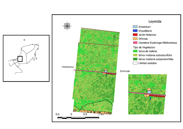 El JB se ubica en el sureste del Centro de Investigación, a un costado de la zona habitacional; mientras que el A en la entrada principal a las oficinas, ambos frente a la carretera 186 (Villahermosa-Escárcega). El JB ocupa un área de 800 m de largo y 50 m de ancho (4 ha), mientras que el A tiene una superficie de 1.6 ha y está dividido en dos cuadrantes, separados por un camino de acceso a las oficinas, establecidos como una colección de árboles vivos (Figura 1). En ambos casos los suelos predominantes son Rendzina y Vertisol, según el sistema de clasificación de FAO (Cuanalo, 1981).