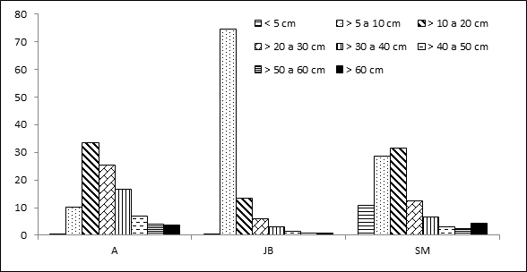 Las estructuras vertical y horizontal en el JB se caracterizaron por una distribución en forma de “J invertida”, con más de 70 % de individuos en las dos primeras categorías. En A y en las SM la distribución es en forma de campana, en la que las categorías intermedias (2 a 4) concentran alrededor de 75 % de los individuos (Figuras 2 y 3).