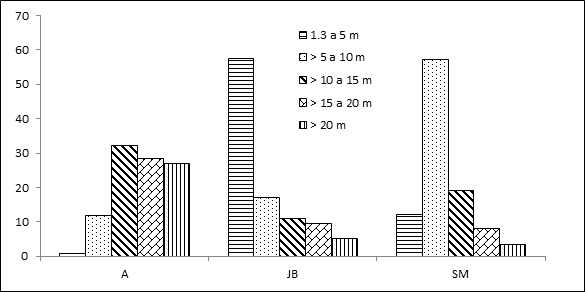 Figura 3 Estructura vertical (altura) en las áreas del arboretum (A), jardín botánico (JB) y selvas (SM) de El Tormento.