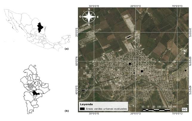 El estudio se desarrolló en la ciudad de Montemorelos, municipio del mismo nombre, en el estado de Nuevo León, al noreste de México. Está ubicada entre los 24°54’ y 25°25’ norte y 99°36’ y 100°11’ oeste, en un intervalo altitudinal de 500 a 2 700 m (Figura 1). El clima predominante es semicálido subhúmedo con lluvias en verano, de menor humedad. La temperatura media anual es de 16 a 24 °C, con un intervalo de precipitación de 500 - 1 100 mm. Los suelos dominantes son Leptosol y Vertisol. La zona urbana está establecida sobre terrenos previamente ocupados por agricultura y de matorral (INEGI, 2009).